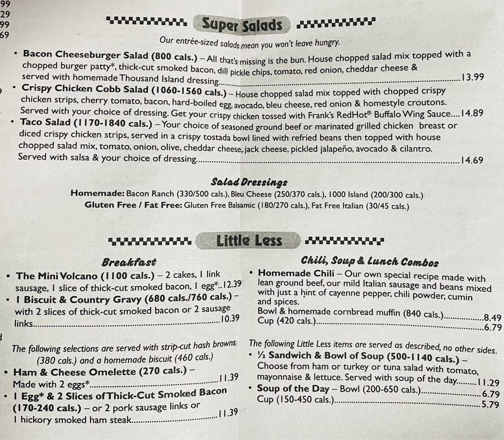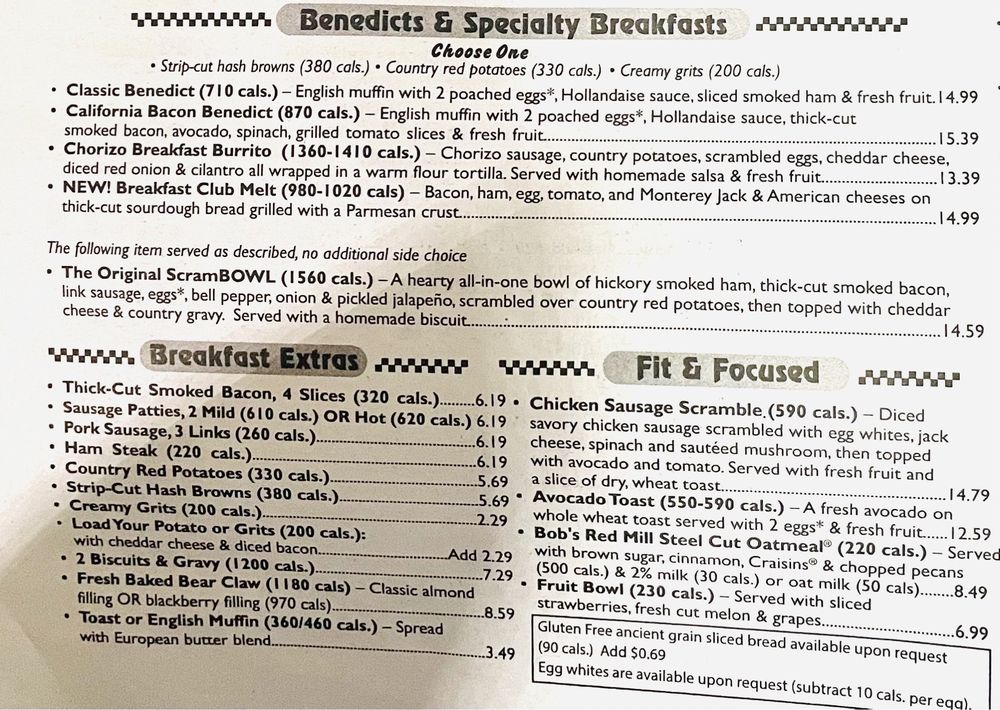 A hearty all-in-one bowl of hickory smoked ham, thick-cut smoked bacon, link sausage, eggs*, bell pepper, onion & pickled jalapeño, scrambled over country red potatoes, then topped with cheddar cheese & country gravy. Served with a homemade biscuit. Served as described, no additional side choice